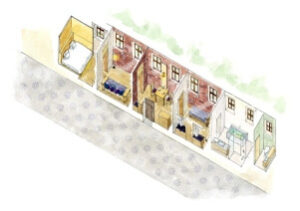 Aralarında, ” 10 Hücreli Süit » sitenin muhteşem dönüşümünü temsil ediyor: on ayrı hücre tek bir görkemli bütün halinde bir araya getirilerek binanın orijinal ölçeğini ortaya çıkarırken çağdaş konfor sunuyor.